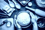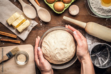 Hands working with dough preparation recipe bread, pizza, pie or samsa making ingridients, food flat lay on kitchen table background. Butter, milk, yeast, flour, eggs, sugar pastry or bakery cooking.