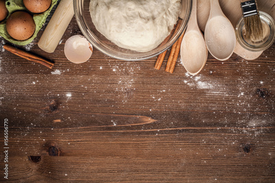 Cooking yeast dough for buns, butter, eggs, cooking equipment, flour on a wooden table. Top view with copy space, mockup for menu, recipe or culinary classes. Baking background.