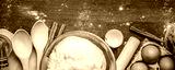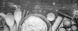Cooking yeast dough for buns, butter, eggs, cooking equipment, flour on a wooden table. Top view with copy space, mockup for menu, recipe or culinary classes. Baking background.