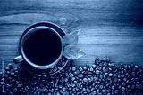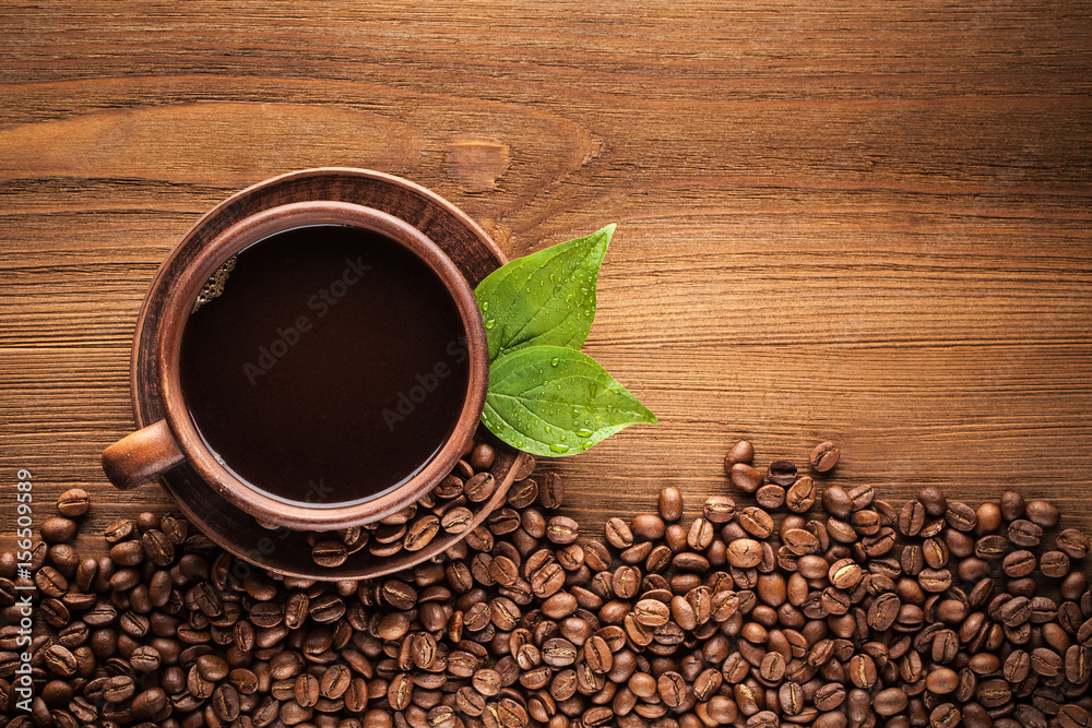 Hot coffee in a clay cup and a plate, whole or ground coffee beans lie on a brown wooden table