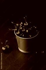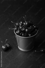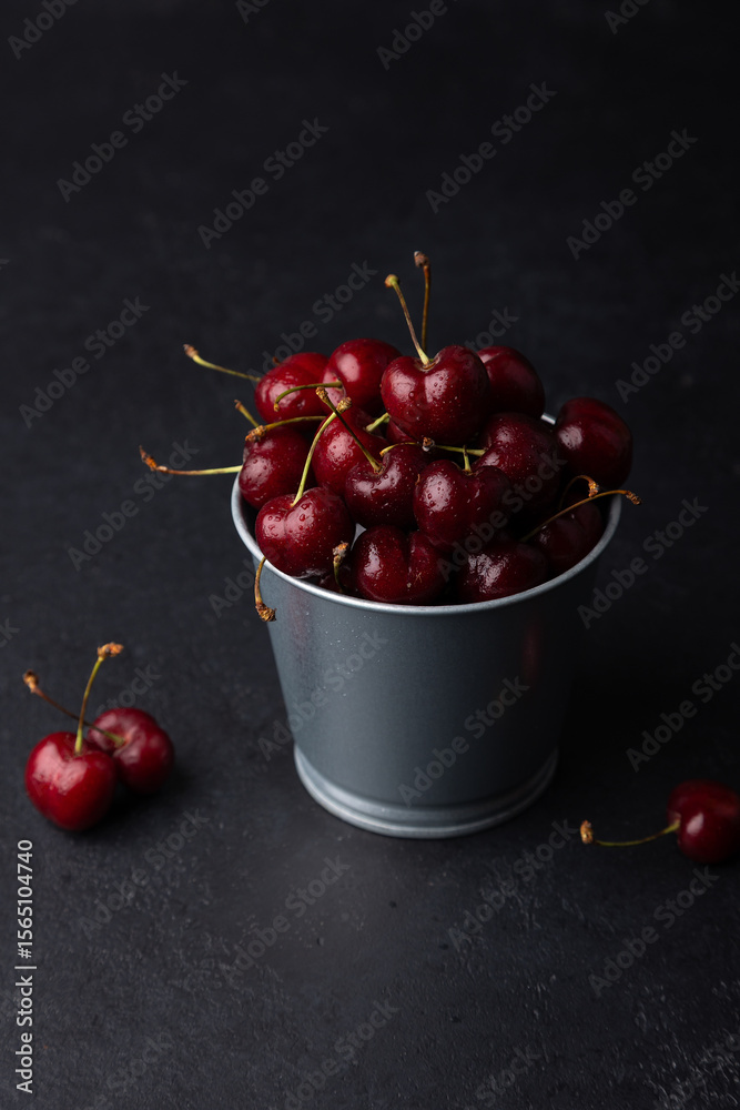 Juicy ripe fresh cherries with water drops in a miniature bucket on a black background. Seasonal fruits, harvest. Selective focus, close-up.