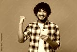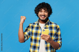 Young happy Indian man he wearing yellow checkered shirt casual clothes hold in hand use mobile cell phone do winner gesture isolated on plain blue cyan background studio portrait. Lifestyle concept.