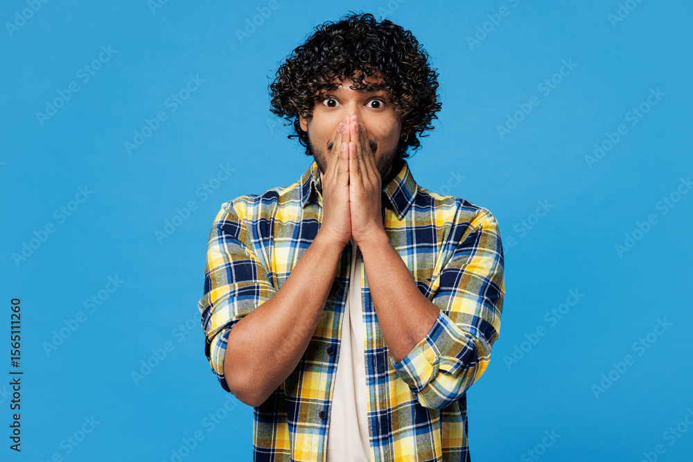 Young exultant jubilant happy Indian man he wearing yellow checkered shirt casual clothes cover mouth with hands look camera isolated on plain blue cyan background studio portrait. Lifestyle concept.