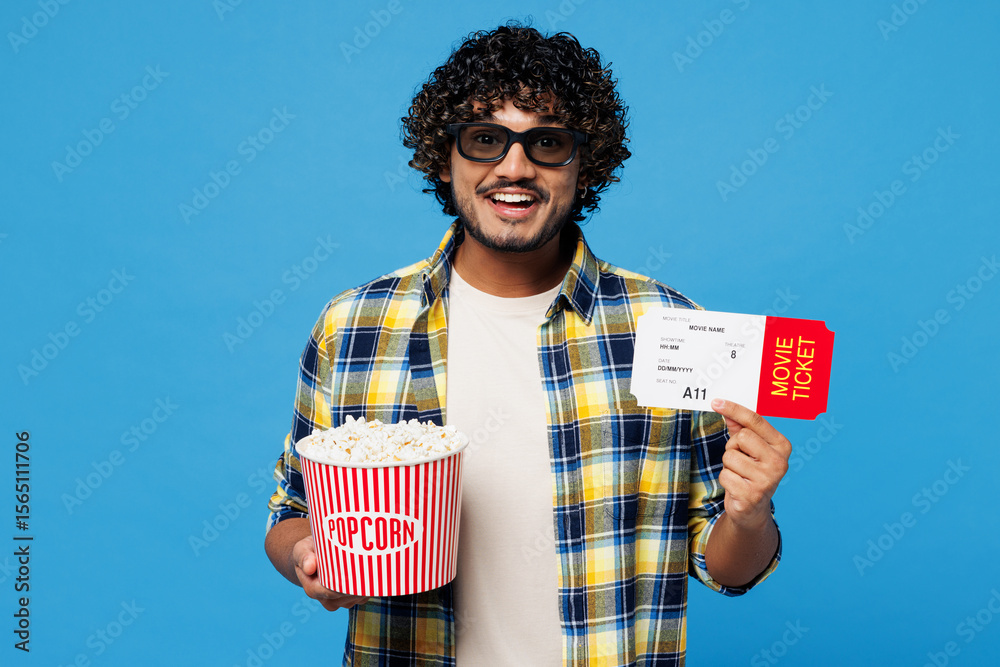 Young fun happy Indian man he wear yellow checkered shirt casual clothes 3d glasses watch movie film hold in hand ticket bucket of popcorn in cinema isolated on plain blue background studio portrait.