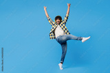 Full body young happy fun cool Indian man wear yellow checkered shirt casual clothes listen to music in headphones raise up hands dance isolated on plain blue cyan background studio Lifestyle concept
