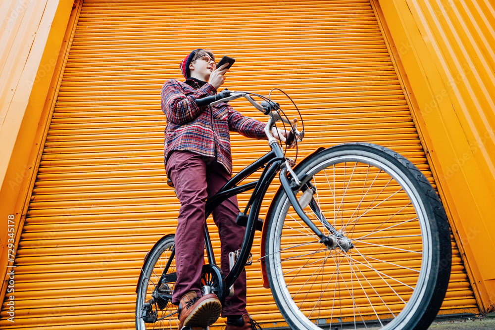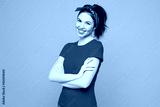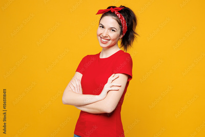 Side view young smiling happy cheerful fun woman she wearing red t-shirt casual clothes hold hands crossed folded looking camera isolated on plain yellow background studio portrait. Lifestyle concept.