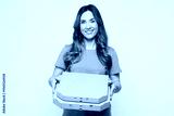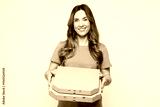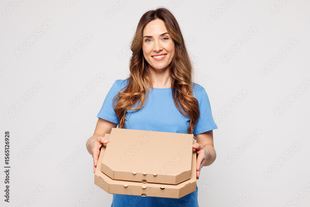 Young smiling happy Caucasian woman she wears blue t-shirt casual clothes hold pizza in cardboard flatbox look camera isolated on plain solid white color background studio portrait. Lifestyle concept.