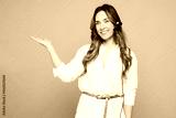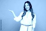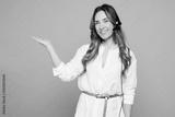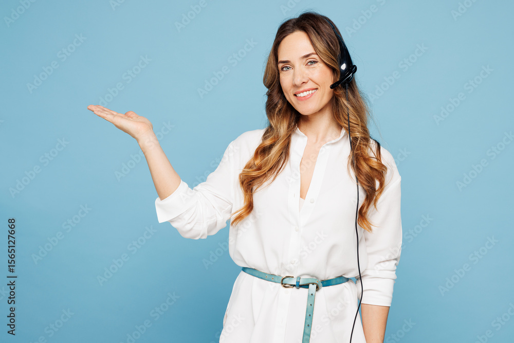 Employee operator business woman she wear white shirt set microphone headset for helpline assistance sit work at call center office point finger aside on area isolated on plain blue background studio.