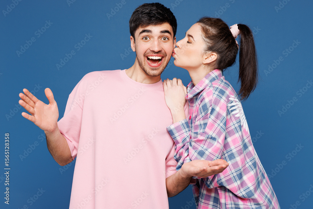 Young surprised couple two friends family man woman wear pink casual clothes together hug embrace cuddle, girl kiss boy on cheek isolated on plain blue background studio portrait. Lifestyle concept.