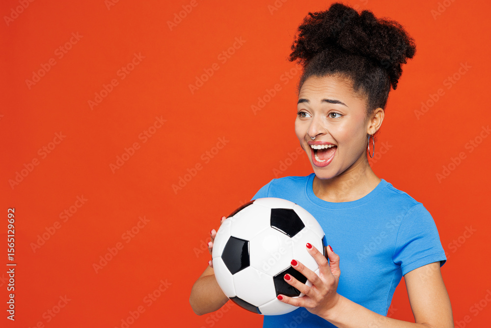 Close up young shocked woman fan she wearing basic blue t-shirt cheer up support football sport team hold in hand soccer ball watch tv live stream look camera isolated on plain red orange background.
