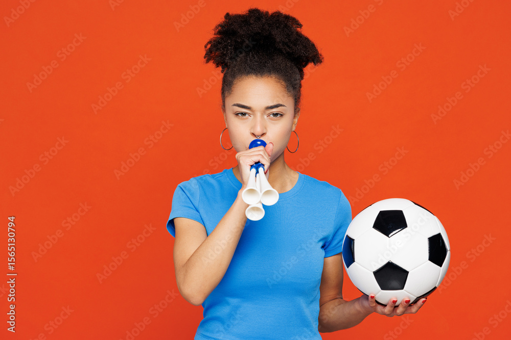 Young woman fan she wears basic blue t-shirt cheer up support football sport team blowing pipe looking camera hold in hand soccer ball watching tv live stream isolated on plain red orange background.