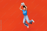 Full body young excited happy woman fan wears blue t-shirt cheer up support football sport team hold in hand catch soccer ball watch tv live stream jump high isolated on plain red orange background.