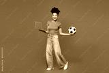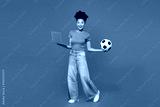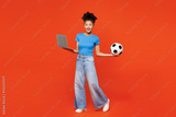 Full body young happy IT woman fan wears blue t-shirt cheer up support football sport team hold soccer ball watch tv live stream use work on laptop pc computer isolated on plain red orange background.
