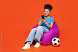 Full body young woman fan wear blue clothes cheer up support football sport team hold soccer ball watch tv live stream sit in bag chair use mobile cell phone isolated on plain red orange background.