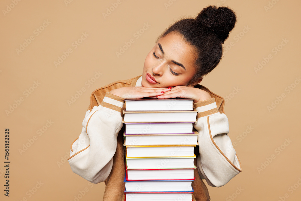 Young sleepy smart girl student wearing casual clothes backpack bag hold put head on stack of many paper books isolated on plain pastel light beige background. High school university college concept.