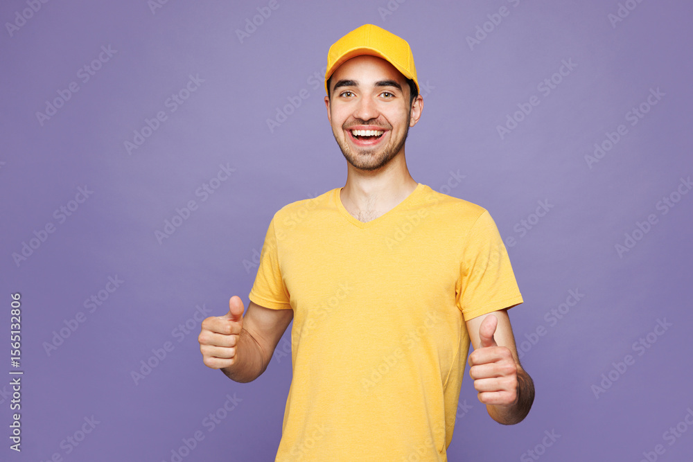 Professional happy delivery guy employee man wear yellow cap t-shirt uniform workwear work as dealer courier showing thumb up like gesture isolated on plain pastel purple background. Service concept.
