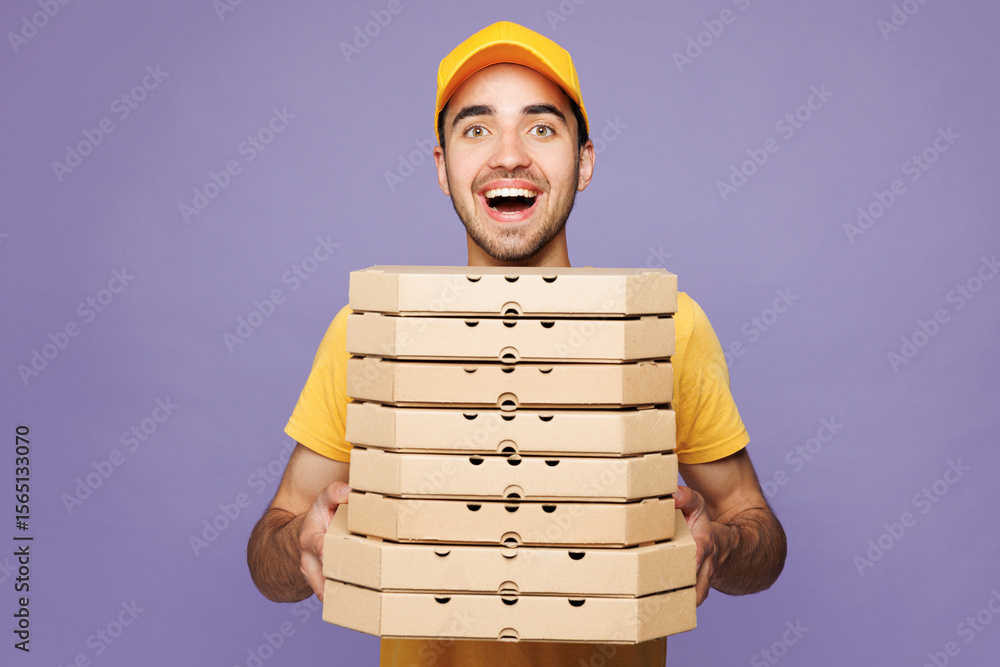 Young surprised delivery guy employee man wear yellow cap t-shirt uniform workwear work as dealer courier hold stack of pizza in cardboard flatbox isolated on plain purple background. Service concept.