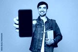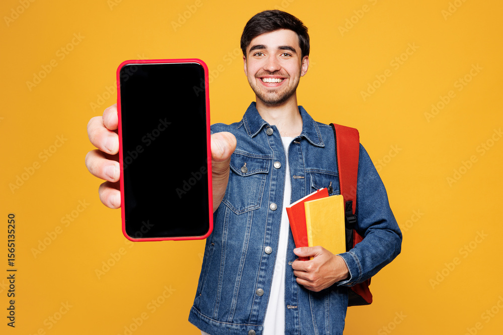 Young smart boy student wear jeans casual clothes backpack bag hold books use close up blank screen area mobile cell phone isolated on plain yellow background. High school university college concept.