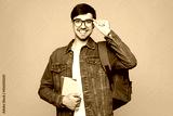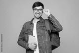 Young smiling happy cheerful satisfied boy student he wear jeans casual clothes glasses backpack bag hold books look camera isolated on plain yellow background. High school university college concept.