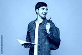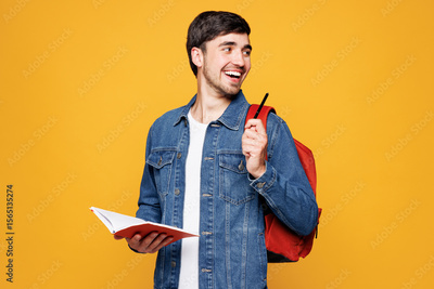 Young happy boy student he wear jeans casual clothes backpack bag hold books write down notes in notebook diary point aside isolated on plain yellow background. High school university college concept.