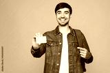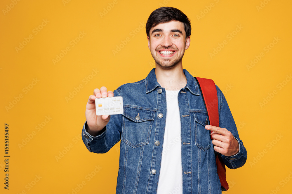 Young smiling boy student wear denim casual clothes backpack bag hold in hand point finger on mock up of credit bank card isolated on plain yellow background. High school university college concept