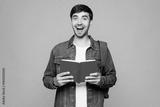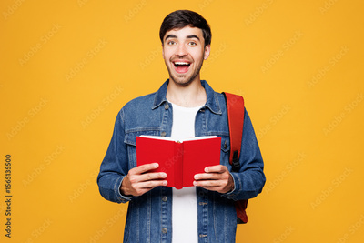 Young surprised shocked impressed boy student he wears denim casual clothes backpack bag hold read novel book look camera isolated on plain yellow background. High school university college concept.
