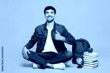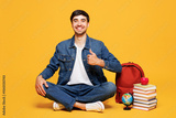 Full body young smiling happy boy student wears denim casual clothes sit near backpack bag hold books globe show thumb up isolated on plain yellow background. High school university college concept.