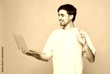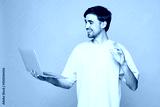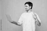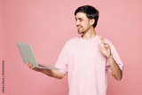 Young Caucasian IT man he wear t-shirt casual clothes hold use work on laptop pc computer waving hand talk speak greet isolated on plain pastel light pink background studio portrait Lifestyle concept