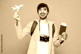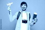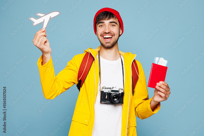 Traveler man wear yellow casual clothes hold passport ticket airplane mockup isolated on plain pastel blue background. Tourist travel abroad in free spare time rest getaway. Air flight trip concept.
