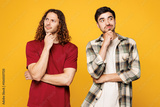Young two friends buddies men they wearing casual clothes together put hand prop up on chin, lost in thought and conjectures isolated on plain yellow orange color background studio. Lifestyle concept.
