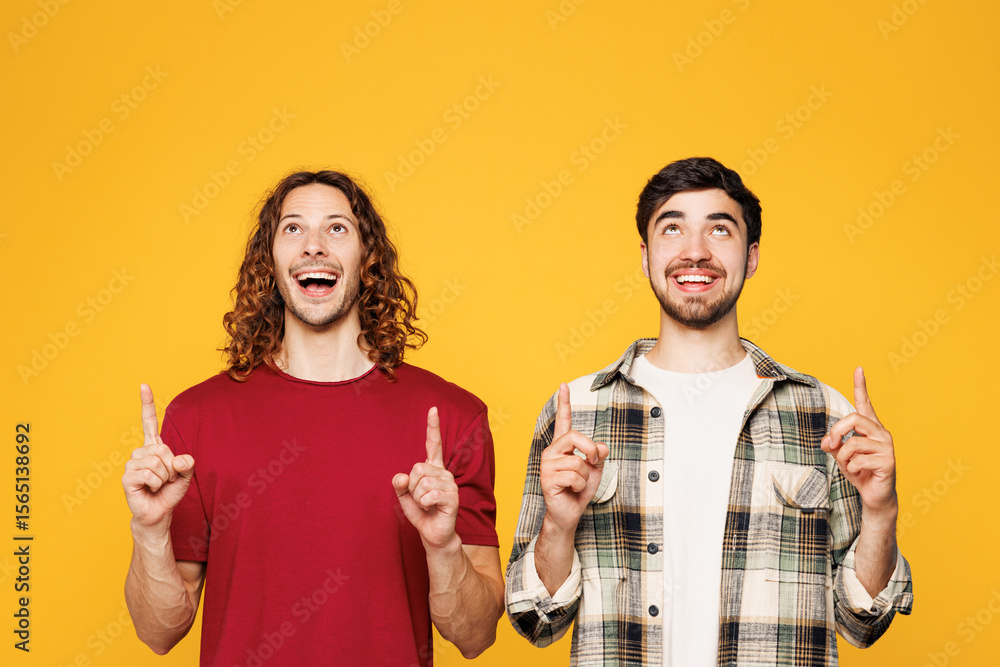 Young happy two friends buddies men they wear casual clothes together point index finger aside on blank area mock up isolated on plain yellow orange color background studio portrait Lifestyle concept