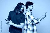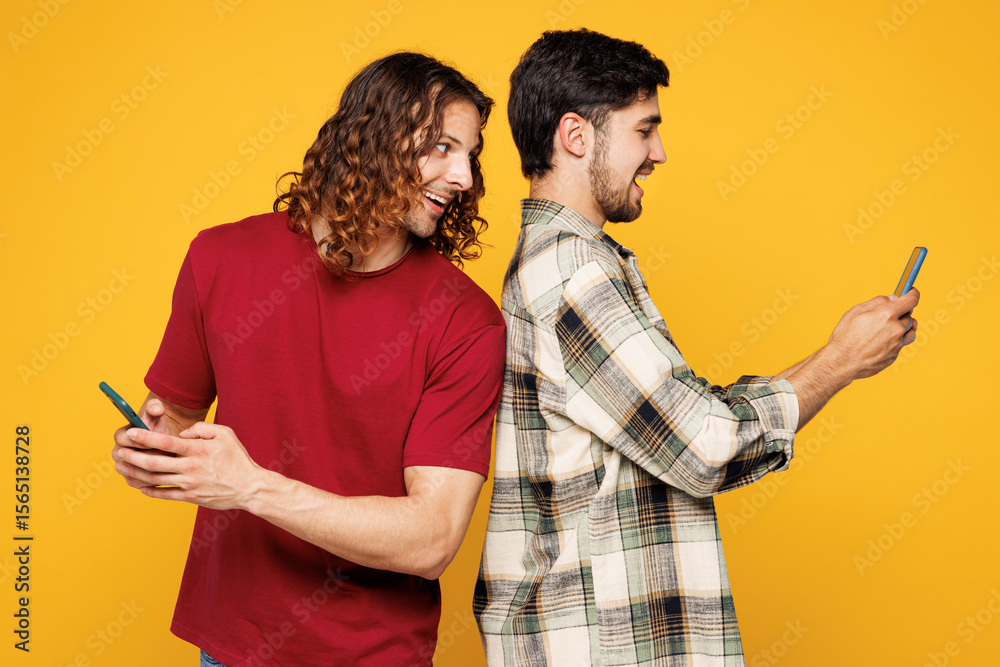 Side view young two friends buddies men wearing casual clothes together hold in hand use mobile cell phone stand back to back peek isolated on plain yellow orange background studio. Lifestyle concept.