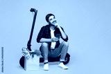 Full body young man he wear casual clothes hold paper bag for takeaway with food products sit on e-scooter use mobile cell phone isolated on plain yellow background Delivery service from shop concept