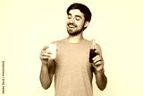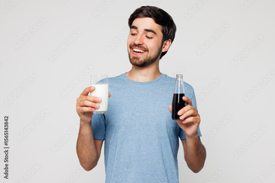 Young man he wear blue t-shirt casual clothes hold glass of milk choose between bottle of cola water isolated on plain solid white background. Proper nutrition healthy food unhealthy choice concept.