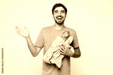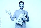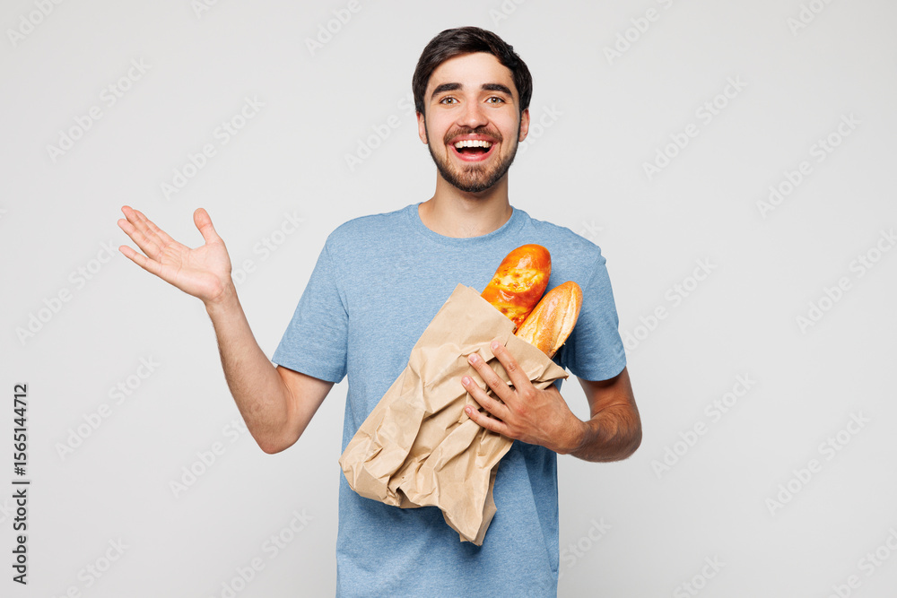 Young happy man wear blue t-shirt casual clothes hold in hand craft bag with baguette bread spread hand isolated on plain solid white background Proper nutrition healthy food unhealthy choice concept