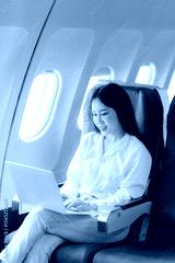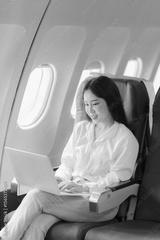 Young woman using laptop computer while traveling comfortably on airplane during business trip. Business and transportation concept.