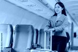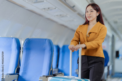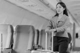Woman holding bag on airplane looking for available overhead compartment to keep it safe on plane travel concept