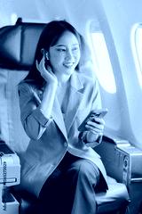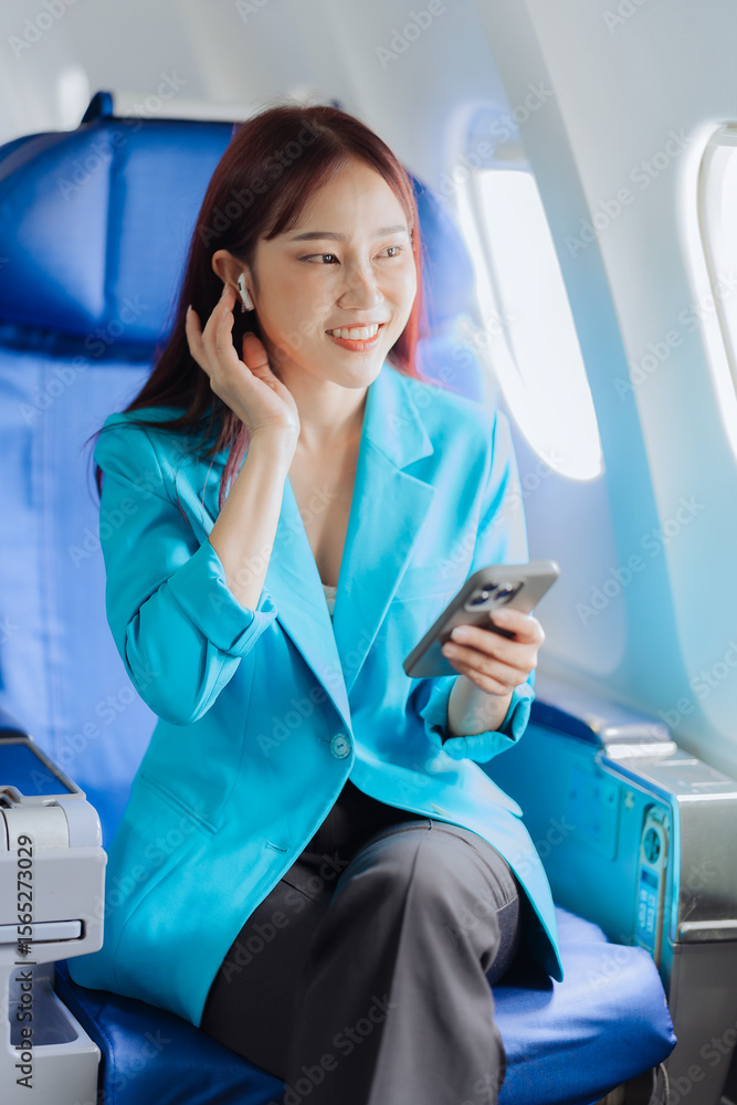 Woman traveling with smartphone on airplane enjoying flight and using wifi connection on airplane to work online travel concept