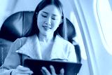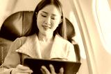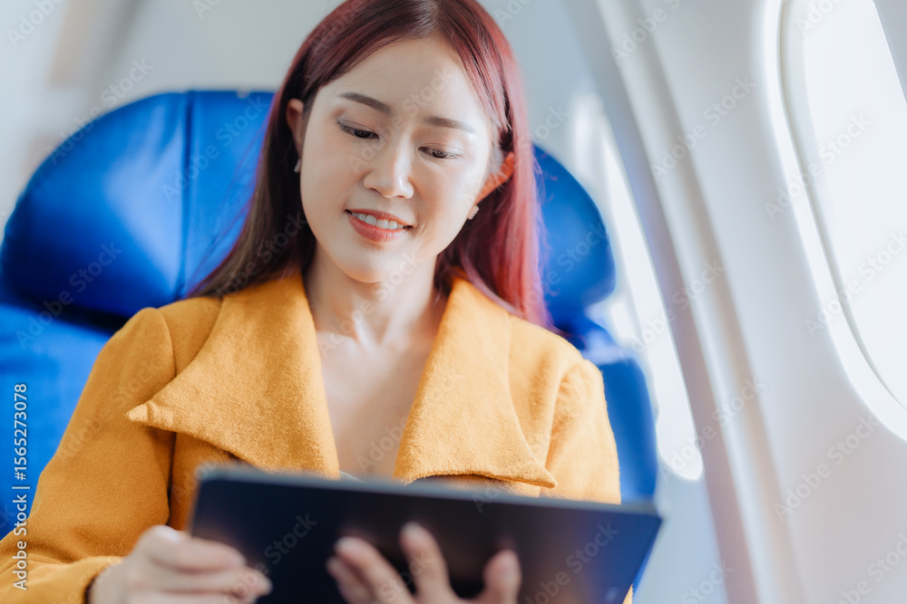 Asian businesswoman traveling by plane using tablet to work and read book to check business report about profit and finance of new startup project.