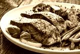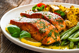 Seared salmon steaks with green string beans and roasted potatoes on wooden table