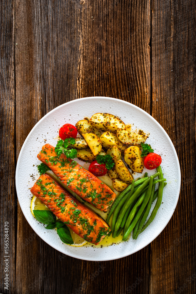 Seared salmon steaks with green string beans and roasted potatoes on wooden table