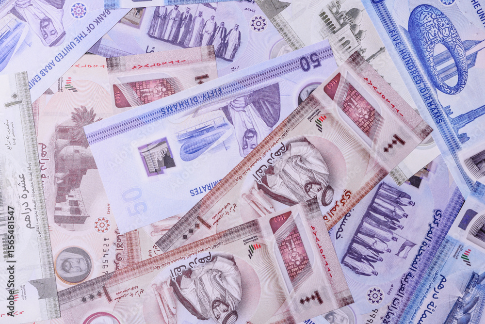 UAE money, dirham, paper banknotes, cash. Emirates money