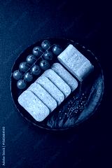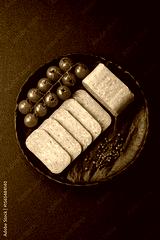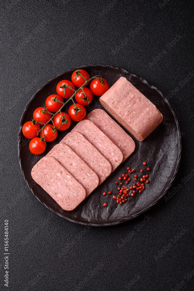 Food, meat, ham sliced in slices for the festive table. Spiced ham