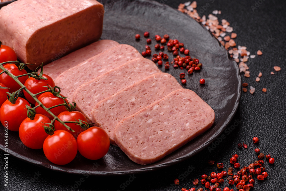 Food, meat, ham sliced in slices for the festive table. Spiced ham