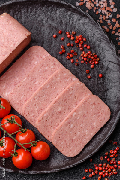Food, meat, ham sliced in slices for the festive table. Spiced ham