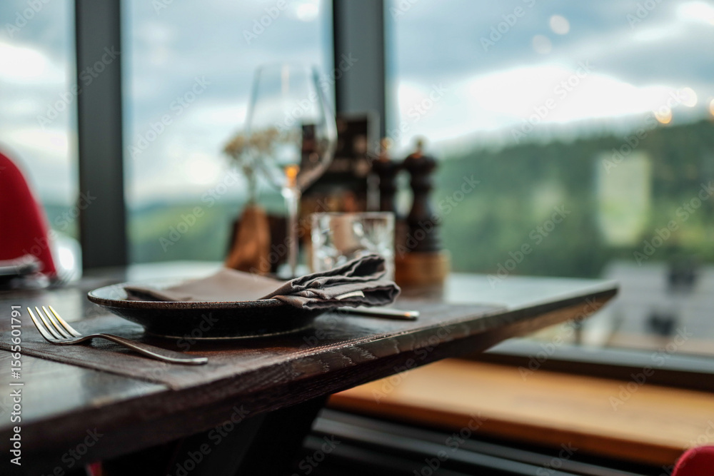 Close-up of elegant restaurant table setting with plate, napkin, fork, and glass in front of large window with blurred mountain view. Cozy dining interior with natural light