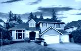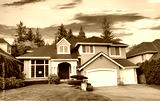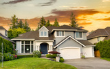 Street view of home with early summer time sunset with blooming flowers, green grass lawn yard and shrubs