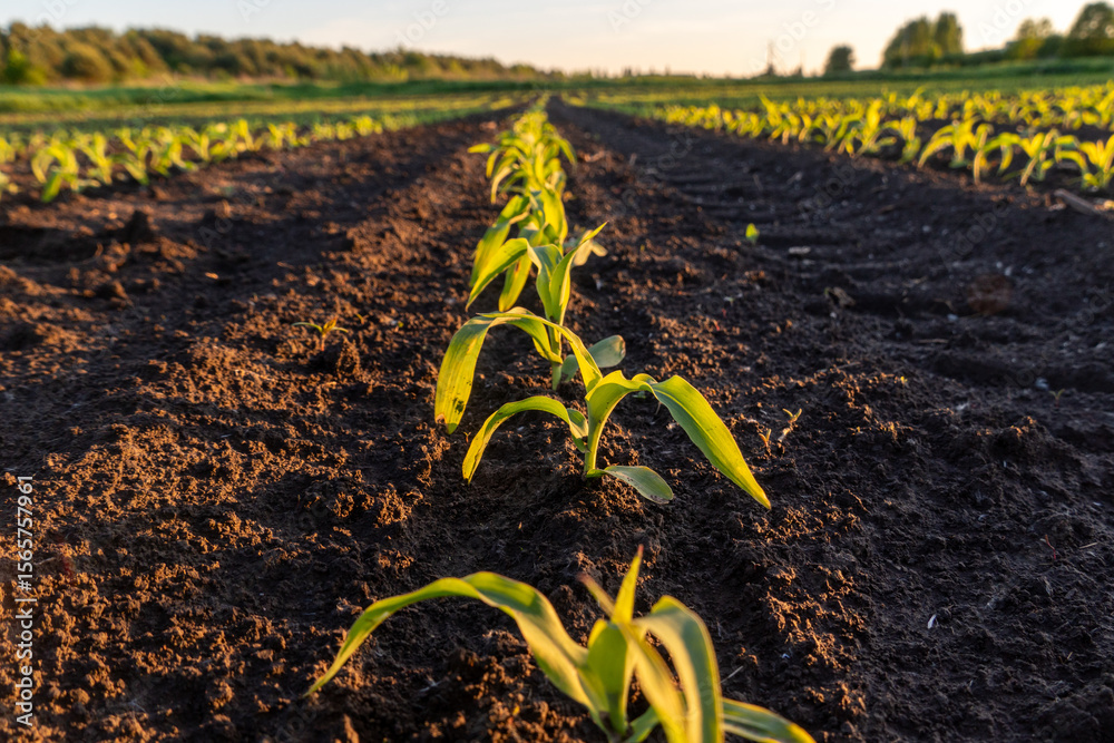 Emerging corn plants stretch towards the warm sunlight, forming neat rows in dark soil, showcasing the promise of a bountiful harvest in a peaceful farming area