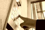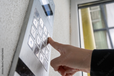 A person is pressing a button on a sleek security entry system attached to a wall in an urban setting while sunlight filters through nearby windows
