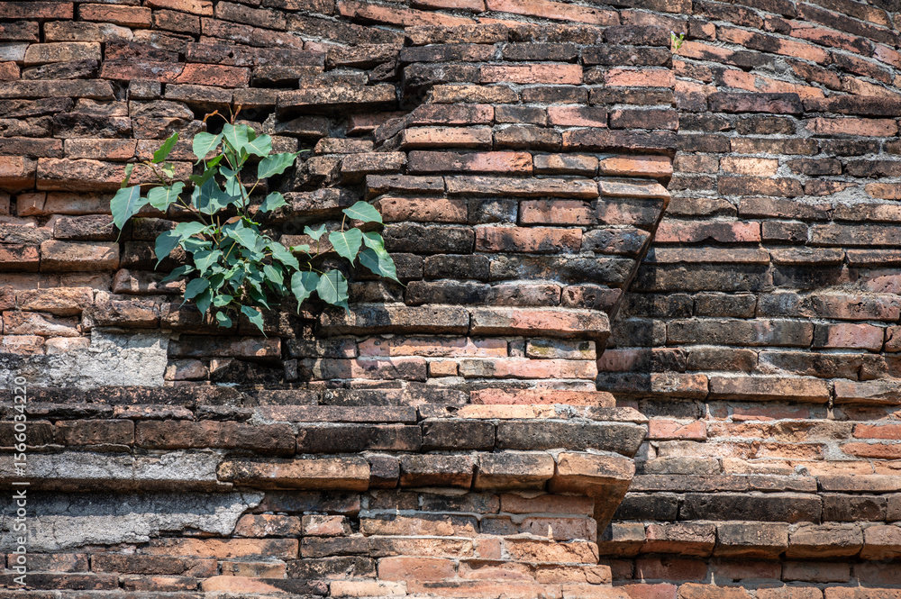 Bodhi trees growing from the cracked surface of old pagoda in Wat That Khieo temple in Chiang Saen district of Chiang Rai province of Thailand.